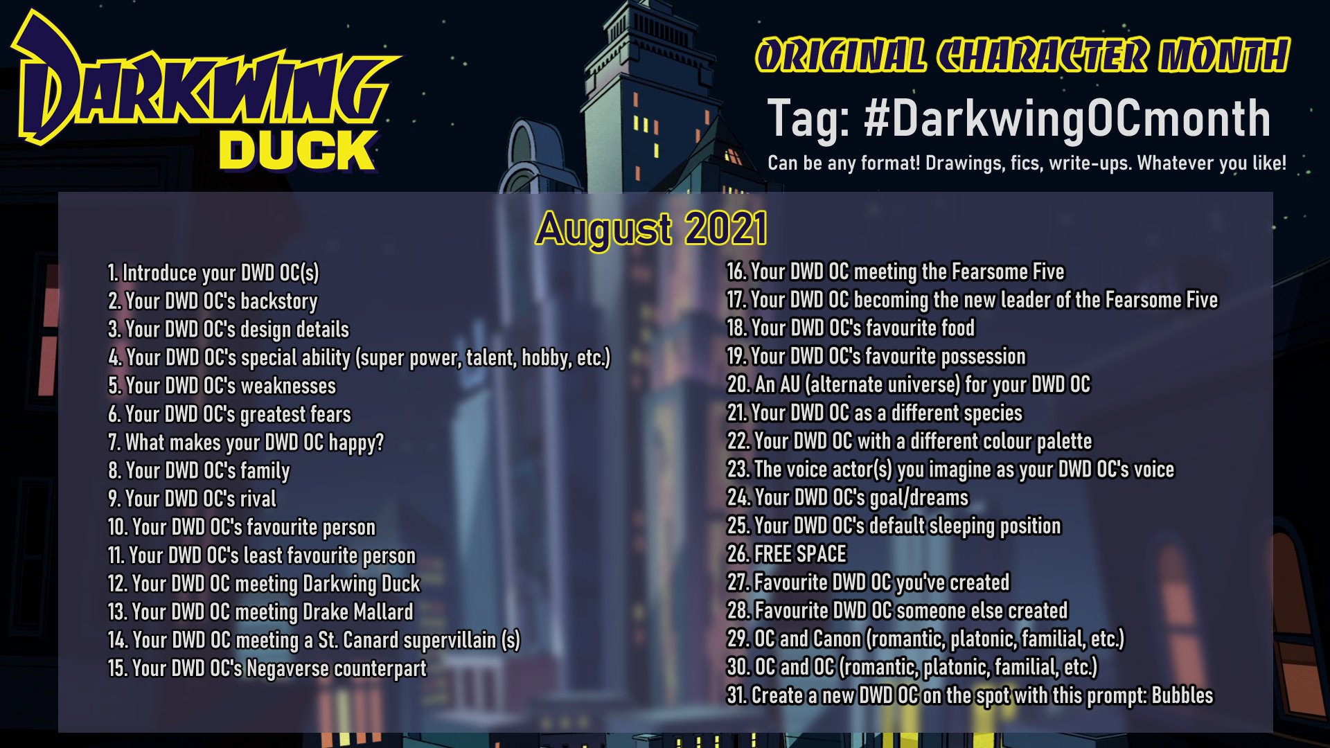 Want to celebrate your original characters? Here’s a list of prompts for DWD OC month! Be sure to tag it #DarkwingOCmonth on social media so we can find it!